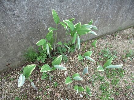 こんばんは。前栽に植えている斑入りナルコユリが大きくなりました。斑入りじゃない方は蕾ができてます。ギボウシの葉っぱも出てきました。芝桜のピン···