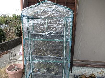 こんばんは。本日やっとビニール温室出しました。出したと言っても棚は一年中置いているのでビニールをかけただけです。霜が降りる前にしたかったので···