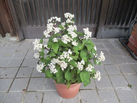 こんばんは。この花はユーパトリウムチョコレートと言います。花が咲く頃になると葉っぱは緑色になりますがそれまでは銅葉色しているのでチョコレート···