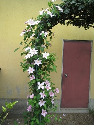 こんばんは。今日は今年のクレマチスの写真です。今年の冬にいつもと同じように剪定誘引したのですが今年はいつもより長く上に伸びました。だから、こ···